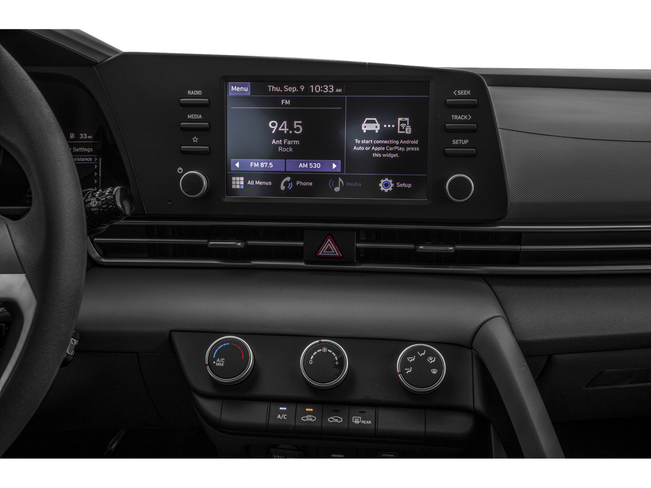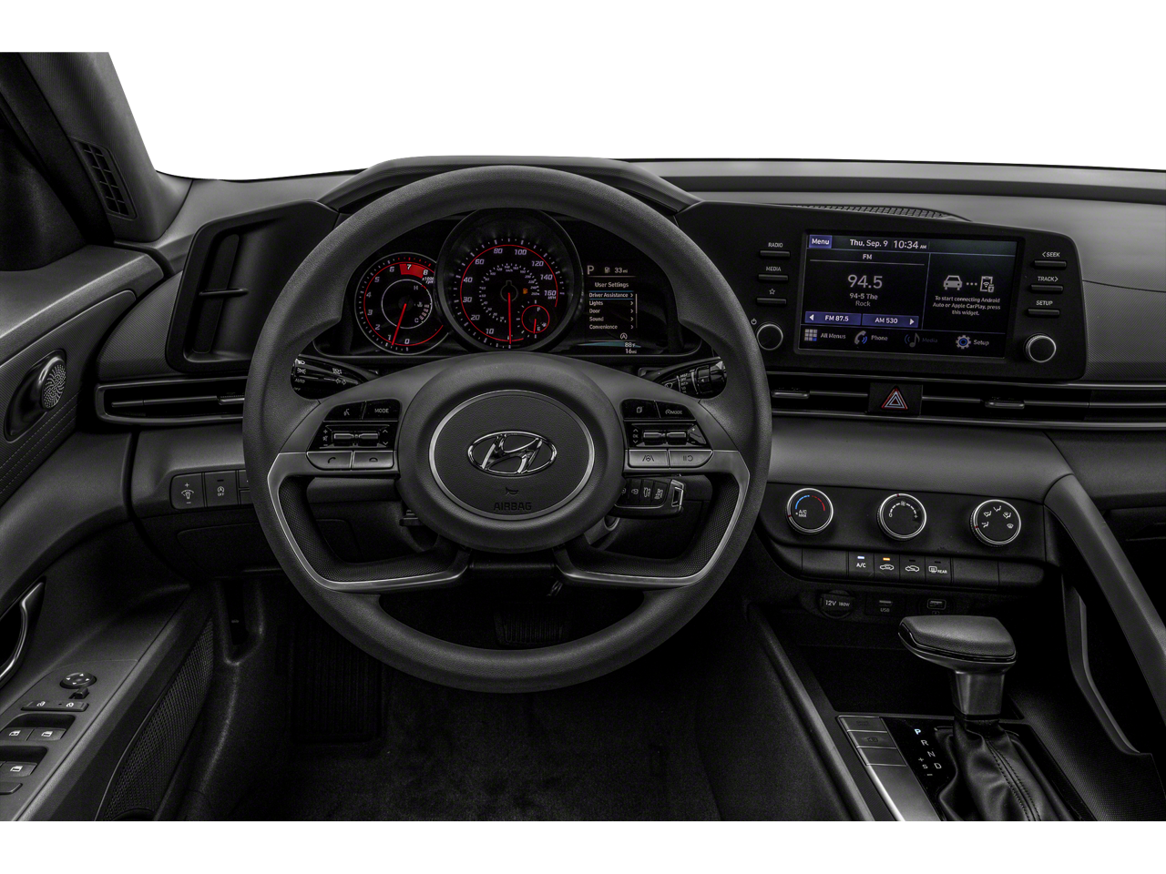 Phantom Black 2023 Hyundai Elantra SE Option Group 01, 15 x 6.0J Alloy Wheels, 4 Speakers, 4-Wheel Disc Brakes, ABS brakes, Air Conditioning, Alloy wheels, AM/FM radio, Apple CarPlay & Android Auto, Auto High-beam Headlights, Brake assist, Bumpers: body-color, Cargo Net, Carpeted Floor Mats, Cloth Seat Trim, Delay-off headlights, Driver door bin, Driver vanity mirror, Dual front impact airbags, Dual front side impact airbags, Electronic Stability Control, Exterior Parking Camera Rear, Front anti-roll bar, Front Bucket Seats, Front Center Armrest, Front reading lights, Front wheel independent suspension, Fully automatic headlights, Illuminated entry, Lane Departure Warning System, Low tire pressure warning, Mudguards, Occupant sensing airbag, Outside temperature display, Overhead airbag, Overhead console, Panic alarm, Passenger door bin, Passenger vanity mirror, Power door mirrors, Power steering, Power windows, Radio: AM/FM/HD Display Audio, Rear window defroster, Remote keyless entry, Security system, Speed control, Speed-sensing steering, Steering wheel mounted audio controls, Tachometer, Telescoping steering wheel, Tilt steering wheel, Traction control, Trip computer, Variably intermittent wipers, and Wheel Locks.33/42 City/Highway MPG